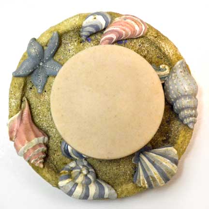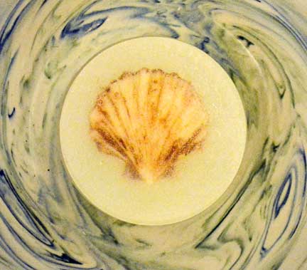 The soaps in the photo above are nice for color samples, but the molds are far too small and irregular in shape to make good soaps. For a fun experiment, I tried suspending them in clear melt-and-pour soap. I enhanced several of the shells with soap paint and suspended them in clear M&P in a round mold. The melted soap base did remove some of the soap paint, but results were attractive.