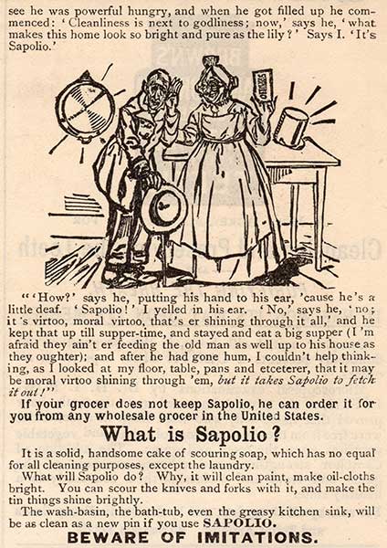 Speaking of scouring soaps, here's a very funny ad for Sapolio, an early commercial soap of this type.