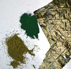 Seaweeds, left to right: kelp, spirulina, nori